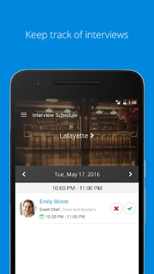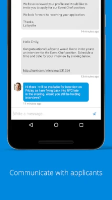 Because you work in hospitality, you're not always near your computer, which is why we created the Harri Hire™ mobile app. - Search our hospitality network for the type of talent your business needs and invite them to apply to your open positions - Communicate with applicants from anywhere - Keep track of who your are going to interview as well as the date and time all from your mobile device!
