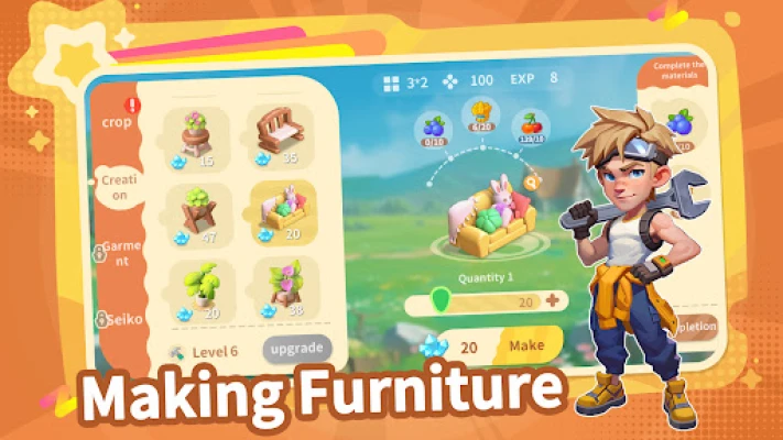 Furniture Crafting: Gather wood and fabric to DIY sofas, tables, and decor, and customize your farmhouse or restaurant interiors!