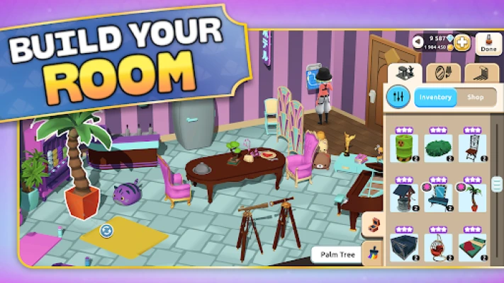 Design and customize your own hotel room with a wide selection of furniture items and decorations!
