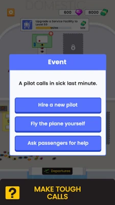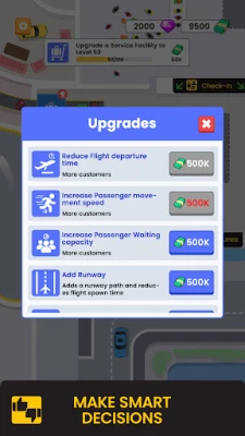 Get ready to manage the airport of your dreams in ✈️ Idle Airport Empire! Build and customize your airport to become the very best Airport that everyone wants to use. Become the master of decision making by choosing the appropriate options to questions and situations wisely and make your airport bigger and more successful. Keep your passengers and crew happy as you grow and more flights take off from your airport while unlocking new services and facilities.