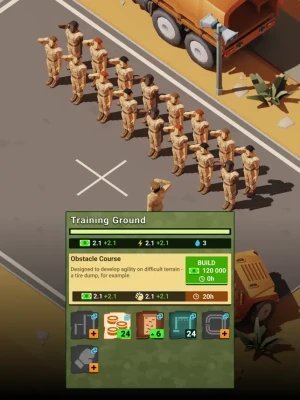 An idle military base is a complex structure which need to build, upgrade and customize. Each building has its own purpose.