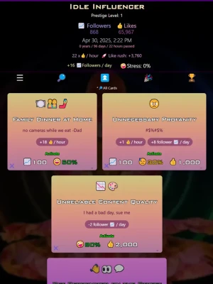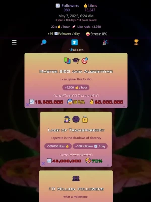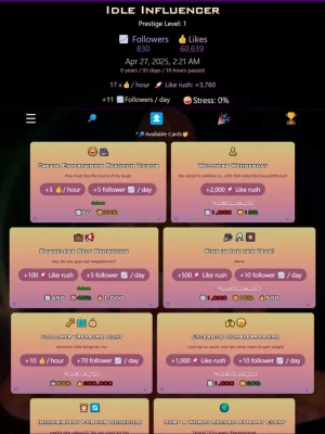 Master the art of online fame as you strategically click on powerful cards to enhance your likes and followers. Each card presents a unique challenge, requiring a delicate balance between increasing your social influence and managing stress levels.