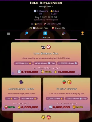 Dominate the social media landscape and become the ultimate influencer in this addictive idle clicker game. Click your way to fame, manage stress, and rule the digital world! Are you ready to go viral? #IdleGame #SocialMediaMastery #InfluencerLife