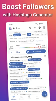 After the generation is complete, the app will show cards with popular hashtags and posting frequency next to the tag. This hashtag analytics will be helpful for ASO and SEO experts in deciding which of the tags to copy into the post. This strategy helps your content to be more visible on social media to increase your followers.