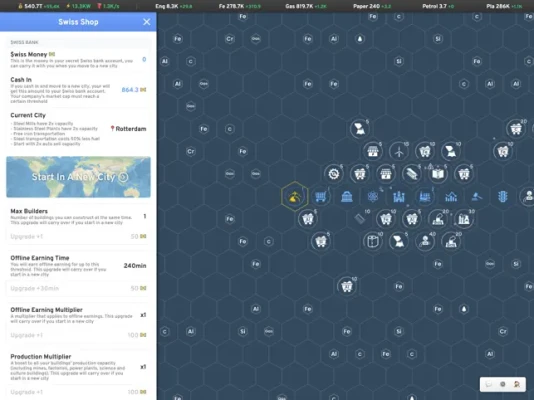 Prestige allows you to unlock new maps with new resources and endless possibilities. You also earn Swiss money to unlock permanent upgrades to help with start faster and expand bigger.