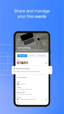 Infomaniak is an independent company owned exclusively by its employees. We don’t analyse or resell your data. You retain full control of your data and can work and collaborate without any limits in a secure ecosystem. The kDrive app is open source and you can consult its code on the Infomaniak github.