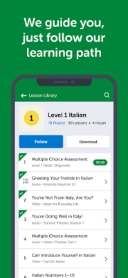Audio/video lessons are just 3-15 minutes. Just press “Play” and learn practical conversations in every quick, podcast-style lesson.