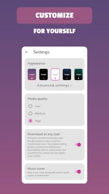 The appearance of the application is made in a modern style. Support for various themes has been implemented. If you like the classic light theme, then at any time you can turn it on in the application settings. Thanks to this, you can download videos from instagram with great pleasure.