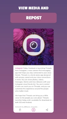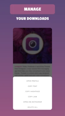 The application implements all the tools for easy viewing of saved photos and videos. In addition to the media files, the description of the post and its author are also saved. Therefore, you can download videos from instagram or download photos from instagram and access the content even when there is no Internet.