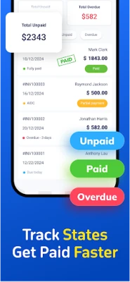 Use this simple invoice maker free to get clear status of each invoice. Get an overview of all payment status at a glance. Easy to change invoice status in this free invoice generator