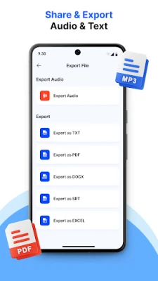 Export options: Save your recordings in a variety of formats (MP3, WAV, TXT, DOCX, PDF, EXCEL, SRT) for easy sharing with colleagues, clients or classmates, archive or integration with other applications,