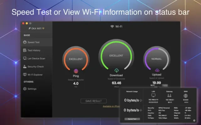 iWifi is your ultimate network diagnostic tool, you can quickly test your internet speed, detect networked devices and view all kinds of network information, and there is also an analysis tool to visualize the nearby Wi-Fi signal.