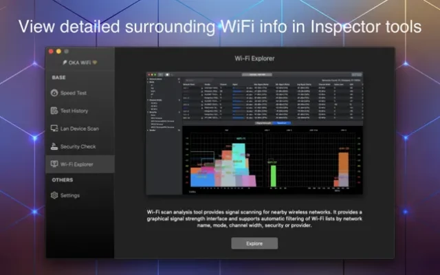 - Wi-Fi signal analysis: if the current Wi-Fi connection is unstable, if there is interference from other Wi-Fi signals nearby, and which signal channels are currently free, it's easy to see in the signal analysis interface.