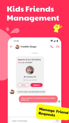 To ensure children's online safety, JusTalk Kids features robust Kids Friends Management. When a kid with a linked parent account attempts to add a friend, the parent will instantly receive a notification on your JusTalk account. The parent can then easily review and approve or deny the friend request, ensuring child's friend list remains safe and only includes verified and trusted contacts.