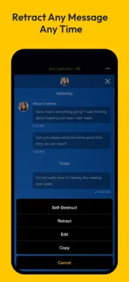 Need your private photos and messages to disappear? We’ve got you covered with our self-destruct timer. Sent something you regret? Retract your message without a trace at any time. Need to blur your screen from prying eyes? Our new stealth mode allows you to blur your screen for maximum privacy. Have you lost your phone and therefore all your messages? Login to the app on a new device and restore your conversations.