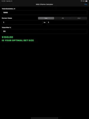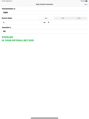 For an even money bet, the Kelly criterion computes the wager size percentage by multiplying the percent chance to win by two, then subtracting one. So, for a bet with a 70% chance to win the optimal wager size is 40% of available funds.