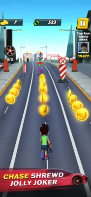 Run on the streets of Sun City and collect as many coins you can. Slide through concrete pipes. Jump over incoming cars and barricades. Tackle through Rock Monster and Dr. Crazy to stay out of their reach and get back on your quest to capture Joker. Grab Magnets on the run to collect all the nearby coins. Seize all the Shields on your way and run through obstacles. Use Power Boots to boost up your speed and help Kicko narrow down the distance between him and Joker.