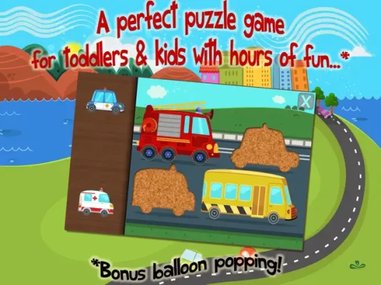 A fun puzzle game for toddlers and kids from ages 1 to 6 featuring 16 cartoon cars and construction vehicles such as race car, police car, school bus, tractor, fire engine, ambulance, garbage truck, excavator, transmixer, bulldozer and more in 20 shape & tangram puzzles!