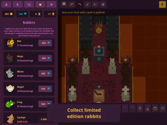 Features • 150 campaign levels • Endless community levels • Sync progress across devices • Spectate other players • Collect limited edition rabbits • Follow your favorite level builders • Create your own levels • Build a following • Earn tips from other players • Watch people play your levels • Unlock new items