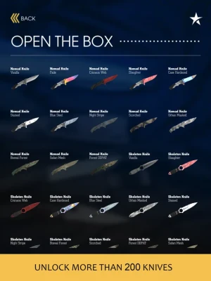 - realistic box opening simulation - you can adjust the sound and motion sensitivity of the device - scale and move the knife - a large collection of boxes, more than 200+ knives