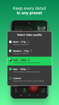 Just want to start video recording? Built-in presets let you choose your recording quality in one click. From small and shareable to epicly detailed. Or define your own custom recording parameters.