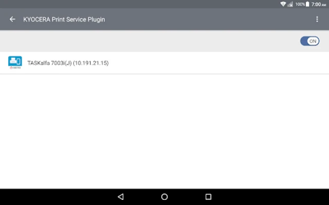 After installing the KYOCERA Print Service Plugin, turn it on by going to Settings > Printing > KYOCERA Print Service Plugin, and then toggle the setting to On. Discovered and manually added printing devices can be selected for printing from any applications where the Print option is available.