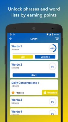 - Earn points by learning and practicing. Then unlock phrases and word lists.