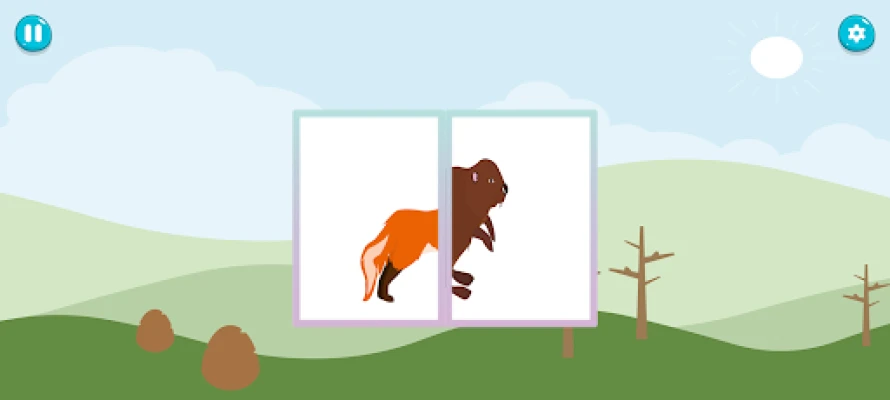 The player flips the cards and tries to find matching parts to complete the animal image.