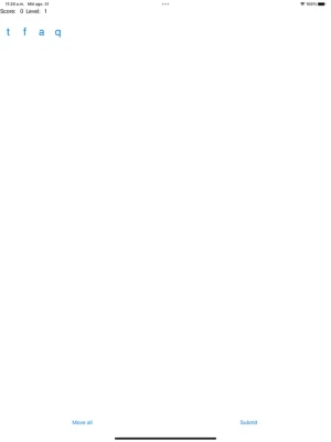 The mechanic of the game is quite simple. The game board consists of five rows of five columns, which may contain letters that appear faster every level. With the letters that appear, you must form words by touching the letters with your finger. When you touch a letter, it will move to the bottom of the board, after the separator, i.e. the word you are trying to form. To submit the word and check if it is correct, (must have at least 3 letters and be in the dictionary of the chosen language -more on that later), you can tap the submit button (or double-tap with 2 fingers if you use VoiceOver). If you want to send all the letters back to the end of the game board, either because you made a mistake or because you saw another letter that can form a better word, you can tap the move all button or, if you use VoiceOver, do the back gesture (2 finger scrub). You can also tap one letter of the letters you have in your word to send it back to the end of the game board.