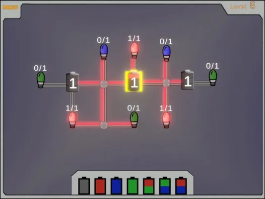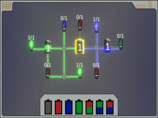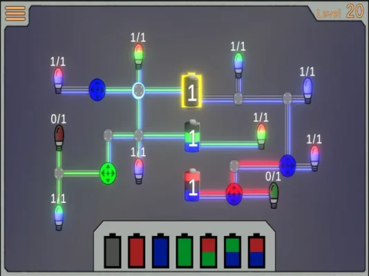 A simple puzzle game to challenge the brain. Use batteries placed in the game to light up all the attached bulbs. Bulbs can only be lit when supplied the correct color. Work your way through harder puzzles.