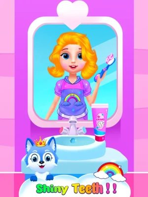 Little Red Girl and her pet Wolfy need you to take care of them and their house. Start by tapping on the curtains and waking up the girl. Go to the bathroom, pick up her toothbrush and toothpaste and wash her teeth until they are sparkling white. Wash her face thoroughly until bubbles form and rinse, then pat her face with a towel to dry it. Next, fill up the tub with water and use shampoo to wash her hair. Make sure to move in circular motions and use the shower head tool to rinse out the bubbles. Now it is time for breakfast: go to the kitchen. Fill up on delicious meals and snacks and feed the wolf as well. Head out to the living room and tap on the phone icon. Select the dress-up feature and buy new outfits at a touch of a button. The decor section displayed on the smartphone allows you to decorate the house as you please. To unlock new furniture and decorations play minigames. After completing a level, you will be rewarded with puzzle pieces and coins. Press on the puzzle piece you wish to acquire and start earning prizes right now. Turn your phone sideways and get ready for the ride of your life. Use the left and right arrows to move and the up arrow to jump. Now, go to the Cake Shop. Finish all orders in time to win candy. If you give Flappy Pet a try you should avoid all obstacles. Try to achieve a high score so you can get more coins. Check out all the mini-games. Exit the phone menu and tap on the pop-it toy located on the right side of the screen. Press on all of the colorful bumps, but try to avoid as many bombs as possible. Play as much as you like. On one hand, if you are a nature lover, head outside and enjoy the scenery. Play basketball: the more points you score, the more money you make. On the other hand, if you are artsy, we created a mini painting studio. Make cute and colorful paintings. Go inside again to complete daily tasks to receive even more cool prizes. Tune in every day to get daily rewards.