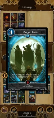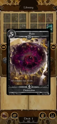 Visit the Forge to create new cards by sacrificing cards from your library. Each forge has a random selection of rare cards that can be forged.