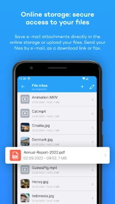 - Access to online storage. Images, videos, music, and documents can be stored in the memory on the go, renamed, accessed, or sent via email/fax