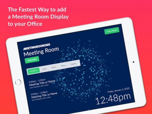 Meeting Room 365 is the Fastest Way to add a Meeting Room Display to your office - providing everything you need to coordinate, schedule, and organize your meeting rooms. Log into your web account to customize the look and feel of the display, and administer all of the tablets on from a single website.