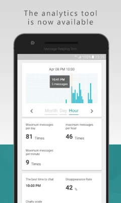 ● Analyze chat statistics such as maximum messages per day, hour, or minute, optimal time to chat, disappearance rate, response rate, etc.