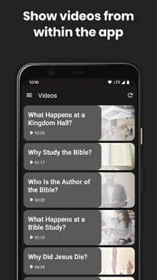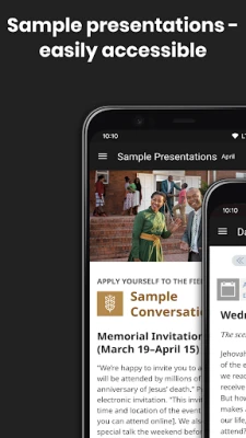 Features: - Write and send ministry report - Take notes - Set a monthly ministry goal - Sample presentations - Download videos - Read the daily text (home screen widget available) - English, German and Italian (other languages partially supported)