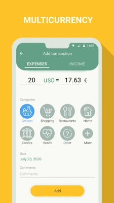 Use ready templates (such expenses as grocery, hobby, utility bills, etc.) or create your own categories, choose any colors and entitle them to adjust the app as you see fit and get the most out of it;