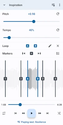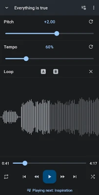 Music Speed Changer allows you to change the speed of audio files on your device in real time without affecting the pitch (time stretch), or change the pitch without changing the speed (pitch shift). Alternatively, both speed and pitch may be adjusted together with a single control. The app is a music looper as well - you can slow down song speed and loop sections of the music for easy practice.