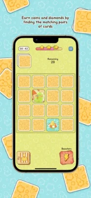 Find the matching pairs of cards, collect coins and diamonds, and decorate your own tiny room!