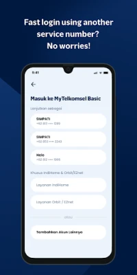 Experience a quick login using more than one Telkomsel number and other service numbers such as IndiHome, Orbit, or EZnet. Your login info will be pre-saved and you’ll be directed to the menu based on the service you use.
