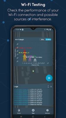 > Check your internet connection by performing speed tests, whilst simultaneously measuring key Wi-Fi statistics such as signal strength, frequency band, channel number, SSID and BSSID