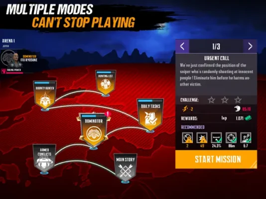 ● Rich gameplay and modes, such as main story, hunting list, daily tasks, dominator, armed conflicts, bounty hunter and so on. You won’t stop playing.