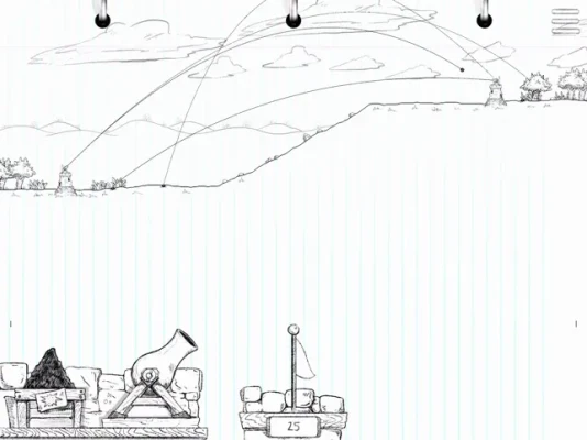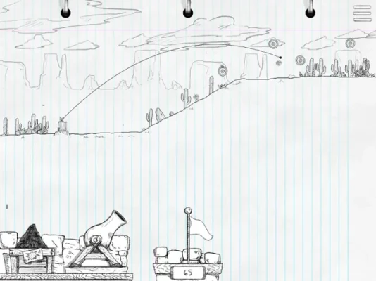 Players choose their "firing angle" and "powder amount" to fire cannonballs at opposing player's towers, or break floating targets in a solo player target practice mode. The randomly generated stage layouts will change strategy from round to round, and wind strength has an effect on a cannonball's trajectory which players must account for. It's simple arcade-simulation-action, fun for all ages, with completely hand drawn game art. It's like you're looking directly into a Trapper Keeper and the imagination of every middle school kid. Whats not to love?