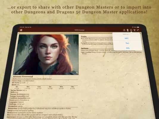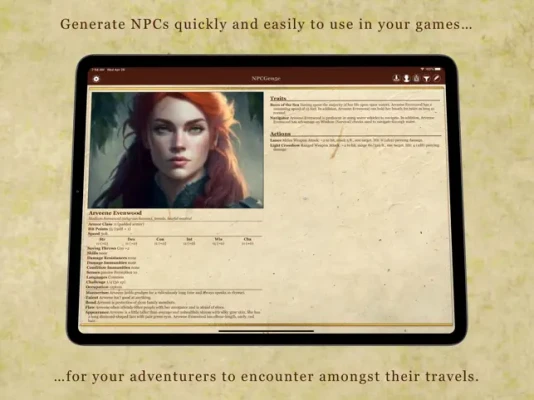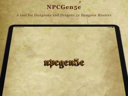 Key Features: Generate quick NPCs on the fly, complete with the following information: • Name • Race and Subrace • Gender • Alignment • Armor Class • Hit Points • Ability Scores • Saving Throws • Skills • Damage Resistances • Damage Immunities • Condition Immunities • Senses • Languages • Challenge Rating • Mannerism • Talent • Bond • Flaw • Appearance • Trait(s) • Action(s)