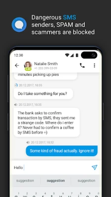 You also can use NumBuster app as a default SMS app in your smartphone (you may choose this option in SMS section of the app at any time) that sends and receives SMS and permanently protects you from SMS spam and fraud.