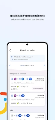 Calcul d’itinéraires : Indiquez vos points de départ et d’arrivée, ainsi que la date et l’heure de votre voyage. L’application vous proposera les solutions les plus efficaces pour vos itinéraires porte à porte, sur le territoire de la région Auvergne-Rhône-Alpes, en combinant l’ensemble des modes de transport disponibles : transport public régional, interurbain et urbain des 50 réseaux partenaires, vélo et véhicule individuel.