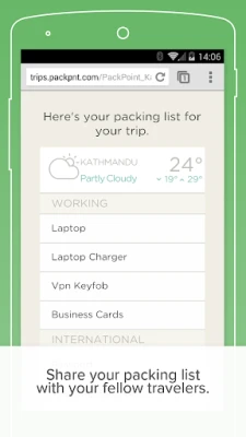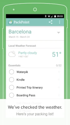 PackPoint is a travel packing list organizer and packing planner for serious travel pros. PackPoint will help you organize what you need to pack in your luggage and suitcase based on length of travel, weather at your destination, and any activities planned during your trip.