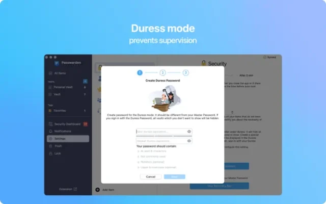 One more extremely secure feature of our password manager is Duress mode. It becomes essential in cases you have to open Passwarden under duress. To benefit from Duress mode, you need to create your Duress password and use it when anyone demands to open our password manager. As a result, there will be displayed only that data you’ve prepared for such situations.