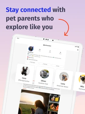 • Discover pet-friendly places through our social feed where you can engage with other pet parents and see adorable photos of pets traveling and exploring many places