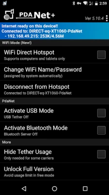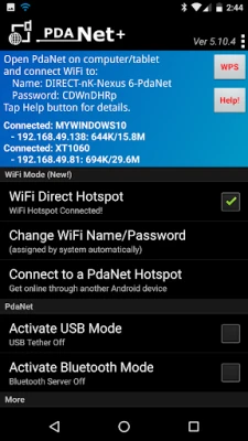 2. Original WiFi Hotspot feature remains in the separate FoxFi app if you still need it, just install from Play Store. You can also find previous (4.19) version of PdaNet+ at http://pdanet.co/install/old